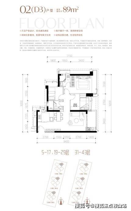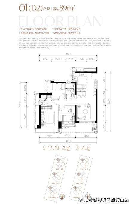 约89㎡3房2厅2卫。